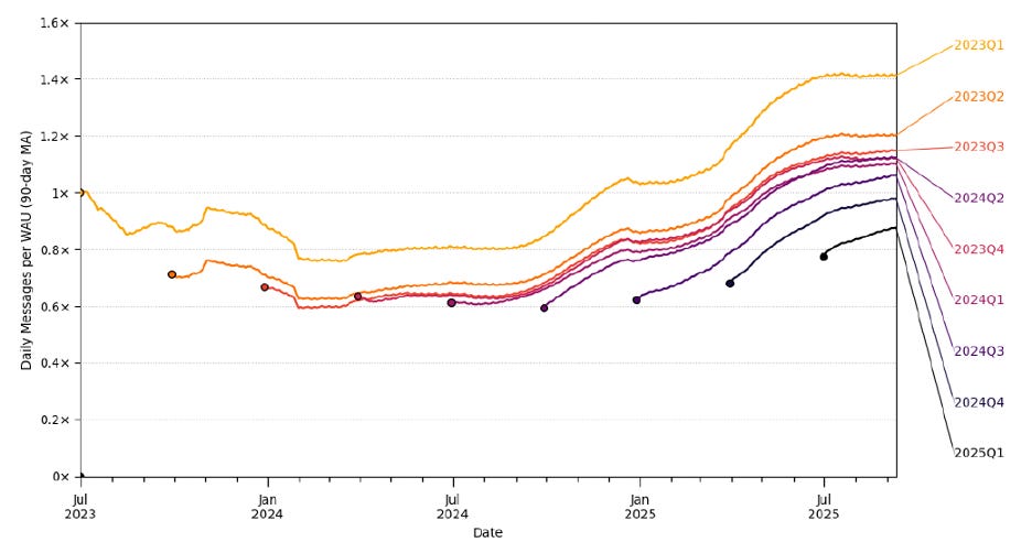 We start the clock on messages per WAU a couple of months after initial signup because we are interested in the behavior of regular-ish users, not people who sign up to try it out for a week or two and then never come back.
