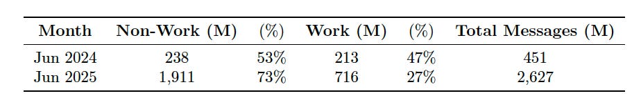 This morning a team of OpenAI researchers and I released a new paper called “How People Use ChatGPT”.1 We document the growth of ChatGPT from its release in November 2022 through July 2025, at which point it had been used at least weekly by more than 750 million people, which is nearly 10% of the world’s population.