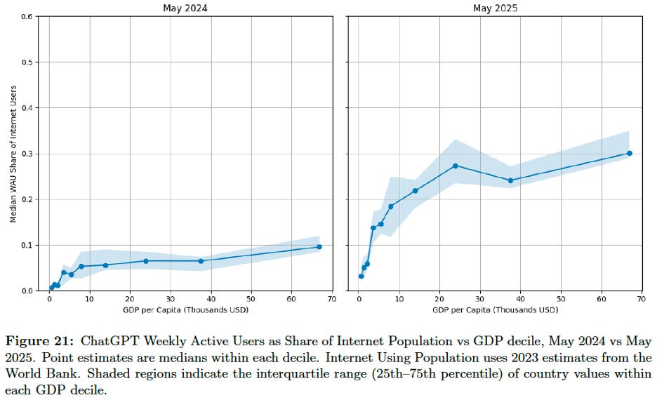 Overall, I was quite surprised at the rapid broadening of ChatGPT use across countries and demographic groups. This doesn’t necessarily mean that AI will be an equalizing force in society. But I have updated my priors substantially on this question.