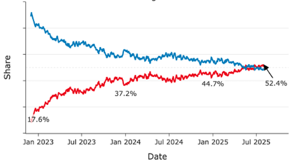 Our paper shows that demographic gaps in ChatGPT usage have closed rapidly. The figure below shows the trend over time in the share of signups by people with typically male or female names.4